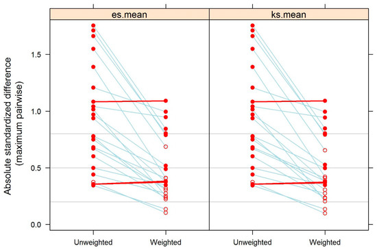 29]. The tolerance limit for the balanced standardized mean difference (SMD) between groups was set at 0.2 [