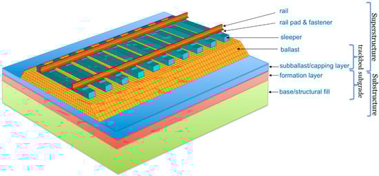 After the construction of the tunnel, the railway infrastructure was constructed. The cross-section of a typical high-speed railway is shown in Figure 1. Railway components mainly include the superstructure and subgrade. The superstructure, including rail, sleeper, ballast, and sub-ballast, is the direct support of the high-speed train. Therefore, it is the most important part of the railway structure. Based on a report from the World Bank [30], railway construction costs per kilometre for a high-speed railway with a speed up to 350 km/h are exhibited in Table 2. It is clear that civil works for the ballast and subgrade contribute to over 70% of the railway’s entire costs [31]. The construction cost of railway tunnels around the world is shown in Table 3 in which the railway construction costs are not included. It can be seen that the construction cost of this project is lower than other tunnels. However, it is to be noted that other examples are long tunnels compared to the tunnel in this study. Therefore, the construction cost is significantly lower.