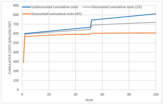 Since both the construction and operation and maintenance stages are significant, the cost of each stage of the tunnel will be analysed using NPV values. As an accurate discount rate cannot be provided, the effect of the discount rate will also be analysed. The undiscounted and discounted cumulative costs (NPV) with regard to the years of operation are shown in Figure 2. It is clear that the cumulative costs of the construction years of the three cases are almost the same because no operation or maintenance costs exist. With the increase of the years of operation, all three cases show linear variations. However, the increased rate of the undiscounted cumulative costs (i.e., i = 0) is much larger than those of the other two cases. In contrast, the cumulative costs with a discounted rate of 4% show an almost constant trend and are much smaller than those with the 1% discount rate. The final cumulative costs at 100 years for the undiscounted case are about 1.5 times those for the discounted case with a discounted rate of 1%. Therefore, the discount rate can have a significant influence on the NPV of a project. In practical applications, this value can be accurately evaluated to provide a reliable cost evaluation.