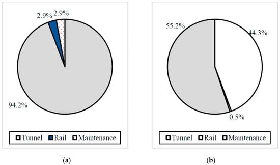 As shown in Figure 3a, the tunnel construction process contributes about 94.2% of the overall life-cycle CO2 emissions. This is due to a large amount of concrete consumed, which also has a much higher CO2 emission coefficient than the other materials. The CO2 emissions induced by the rail construction process are comparable with those produced by the maintenance process. The construction process (i.e., both tunnel and rail construction) contributes approximately 97.1% of the life cycle’s CO2 emissions and the CO2 emissions caused by the maintenance process appear to be negligible compared with the construction process. However, Figure 3b shows that about 55.2% of life-cycle energy consumption can be attributed to the maintenance process. The energy consumption of the tunnel construction process is approximately 44.3% and the portion from the rail construction is much smaller (less than 1%) and can be ignored.