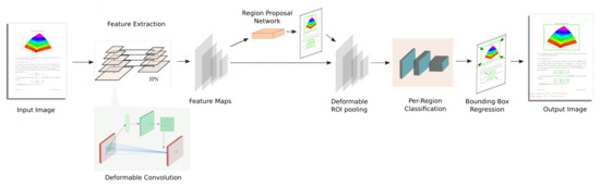 The proposed method is based on deformable convolution networks (DCN) [26,27]. Convolutional neural networks learn the relevant feature representation depending on the task at hand [28]. These features are extracted in every layer using filters. Filters in lower convolutional layers usually capture textures and preliminary objects, which includes gradients, textures, materials, and colors, whereas filters in higher convolutional layers describe more abstract objects and their parts [29]. In traditional CNNs, a convolutional layer samples the input feature-maps at fixed locations, which the subsequent layers carry forward, resulting in a fixed and known geometric transformation. Using the fixed grid for the detection of objects occurring at different scales and different transformations is not ideal. Deformable convolutional networks address these constraints of traditional CNNs by introducing two additional modules to existing deep neural networks, namely (i) the deformable convolution and (ii) deformable RoI-pooling. Regular convolutional layers are augmented with a -offset convolutional layer to form the deformable convolution layer. Regular convolution operates on a uniform grid as its receptive field, whereas deformable convolution leverages the additional offset layers to augment the uniform grid conditioned on the input. The adaptive receptive field allows filters in convolution layers to adapt to different scales and transformation. Since objects like figures and formulas appear at vastly different scales, the deformable property significantly helps in coping up with these intense input variations. Mathematical formulation of deformable convolution is explained in [26] as: