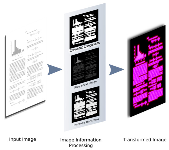 We use color transform, connected component analysis, and distance transform to generate Fi-Fo image representations. Gray-scale image retains the original information of the input image in a single channel. Connected component analysis is applied horizontally to identify regions in the image. Distance transform conserves the precise distance between page objects and blank regions. Additionally, we also reverse the distance transform, i.e., the maximum value occurs at the textual regions and diffuses smoothly as a function of the distance to the textual regions. We stack these representations together to feed them to the network. Figure 2 shows the Fi-Fo image representation with intermediate information in every channel.