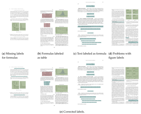 Initial experiments led us to the discovery of the problems in annotations of the ICDAR-2017 POD dataset. Some of these problems are highlighted in Figure 4, where green, blue, and brown color annotate figures, formulas, and tables, respectively. There were missing annotations, which include formulas, figures, and tables, as shown in Figure 4a. There were occasions where page objects were mislabeled, i.e., formulas annotated as tables, text annotated as formulas, and so on. As shown in Figure 4c, text-lines are labeled as formulas which can confuse the system to distinguish text from formulas. Similarly, in Figure 4b, a block of formulas is labeled as a table, again creating vagueness for the system. There were inconsistencies in the figure’s annotation, as shown in Figure 4d. Common problems with figure annotation include over-segmentation, under-segmentation, and inconsistent labeling for multi-panel figures, i.e., at some instances, objects enclosed inside a solid boundary are annotated as single figure considering outer bounding box, while for other similar instances, the outer boundary is neglected and enclosed objects are annotated individually. These irregularities in original annotations resulted in penalizing the overall performance of the system.