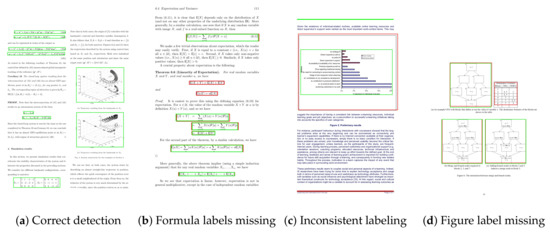 As exhibited in Figure 5, the Fi-Fo detector is working fine, correctly detecting the page objects, i.e., figures and formulas in particular, but the performance is not reflected in numbers. Upon investigating the results, we discovered the irregularities and inconsistencies in the original annotations available for the ICDAR-2017 POD dataset. There were clear examples of missing annotations for page objects, as the case in Figure 5b where annotations for formulas were missing. Confusions between figure and table annotations are briefly shown in Figure 5d. Figure 5c establishes the case of inconsistent labelling for figure annotations. There were examples of over-segmented ground-truth where captions or text-lines were annotated along with figure or table, as shown in Figure 4c. These inconsistencies have been already discussed in detail in Section 4.1.2.