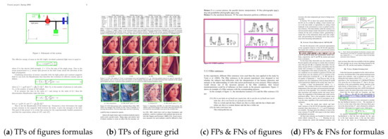 Analysis of results generated by Fi-Fo detector using the ICDAR-2017 POD (corrected) dataset, green color highlights true positives (TPs), blue color signifies false positives (FPs) for formulas and magenta color flags FPs for figures, and red color annotates FNs for both classes.