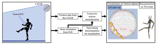 Any human motion is a sequence of quaternion rotations, visually represented as a trajectory on a 3D unit sphere. Figure 1 shows an overview of the proposed Motion-sphere. A 3D LiDAR sensor is used to track the position of a moving human body. The 3D position of the pelvis is computed while using the segmentation of raw point cloud data based on the user’s height and IMU sensors are used to estimate the orientation of each bone joints during human body motion in a real environment. When a user performs a motion, orientation data from the IMU sensors are transformed into a 3D avatar’s coordinate frame for reconstruction.