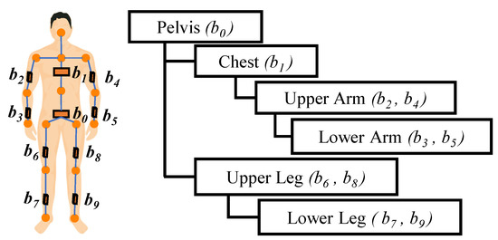 A human body motion is a hierarchical movement with a parent–child relationship between joint–bone segments. The current work captures the movement of 10 hierarchical joint–bone segments, as shown in Figure 2, for full-body motion. IMU sensors attached to these segments give bone rotation data as quaternions. Initial calibration is performed for accurate reconstruction and visualization. The calibration aligns the 3D avatar’s segments with human bone axes. The quaternions that were obtained from the user’s T-pose () rotate and align the subsequent raw quaternions () from the sensors to the bone axes (i.e., ). The 3D avatar reconstruction is achieved by rotating prefixed 3D vectors (, that are initially aligned to the bone axes) by the resulting quaternion (i.e., ).