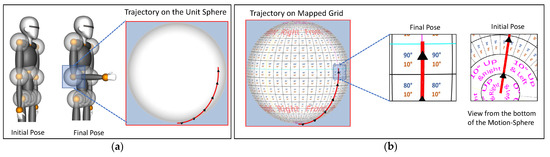 The mapped grid comprised of equidistant cells running from 0°–180° on the right and left side, starting from the front of the sphere. Vertically the cells go 0°–180°. The visualization presented in the current work, the grid cell size is 10°. The grid size may differ for different applications; this is discussed further in the experimental study. Figure 3 shows the right lower arm swinging from the attention pose to the front of the body by 90° and correspondingly visualized on the Motion-sphere (Figure 3b).
