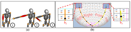 Upper arm has a 90° swing toward the right of the body and, the lower arm has a 90° swing in front of the upper arm: (a) A combined swing movement of parent–child (upper right arm–lower right arm) on the avatar. (b) Visualization of the combined swing movement on a Motion-sphere.