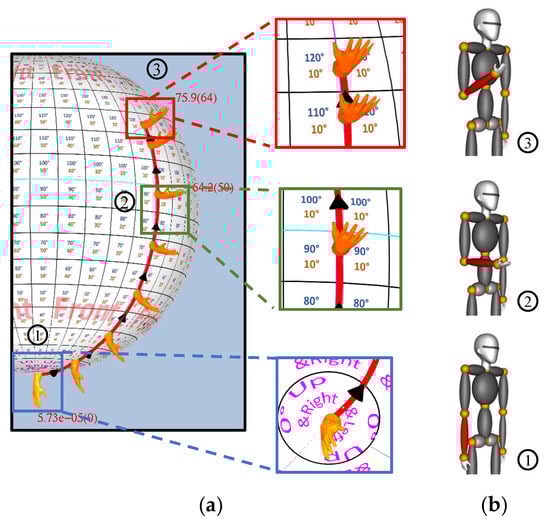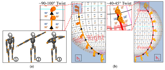 The twist orientation of the 3D models placed at equal distances on the swing trajectory enables the intuitive visualization of the complete human joint bone motion. Figure 6 shows an example of a simple twist–swing motion in the lower right arm. In Figure 6b, the avatar exhibits a lower right arm twist of approximately 75°–80° from attention pose (1) to end pose (3), while the actual twist is 75.9° as shown on the Motion-sphere. The models are also gradient colored in order to indicate the extent of the twist in the bone axis (color gradient is shown in Figure 5).