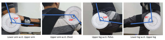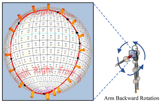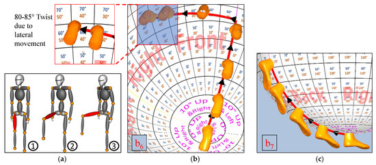 The swings a point on a sphere to a new position , as discussed in Equations (1)–(3). However, the position of a point on the sphere does not change for a twist rotation of the bone. Therefore, only a trajectory would not suffice to represent a combination of twist and swing. To visualize the twist rotation by the bone axis , the Motion-sphere makes use of 3D models of the upper and lower limbs, as shown in Figure 5.
