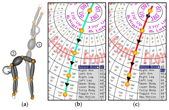 (a) Overlapping avatar depicting movement between the two key poses 1, and 2 (b) Visualization of trajectory on the sphere associated with pelvis (), selected among the menu options (c) Visualization of trajectory on the sphere associated with chest (), selected among the menu options.