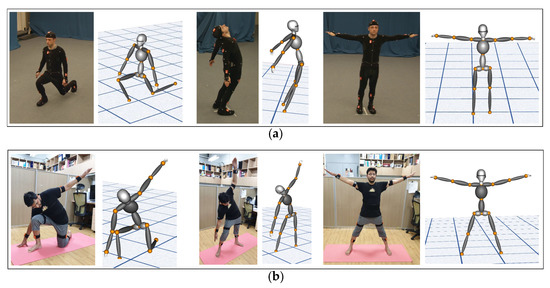 In this section, we validate the accuracy of our 3D model motion reconstruction. Avatar is developed while using a visualization toolkit (written in C++) [25]. The procedure for updating the avatar is beyond the scope of this article (briefly described in Section 3.1). However, we briefly discuss the accuracy of reconstruction on the avatar, as the avatar is one of the two modules of the Motion-sphere. The TotalCapture dataset [10] has varied ROM; this can be directly applied on our 3D avatar to validate its reconstruction accuracy. Figure 11a shows a few selected reconstructed poses from the TotalCapture dataset against their ground truth images. Figure 11b shows multiple poses that were reconstructed on the same model using our data against the ground truth images. The result shows that the reconstruction is reasonably accurate.