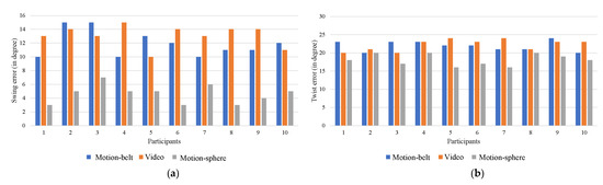(a) Average participant’s swing prediction error against the ground truth (b) Average participant’s twist prediction error against the ground truth, for Motion-belt, Video and Motion-sphere.