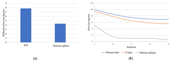 When the participants were presented with five sets of motion, each motion comprising two data for comparison, and asked to provide their perceived difference w.r.t. the swing and twist, an average error of 8° was noted in STS and 4° in the Motion-sphere, as indicated in Figure 15a. The learnability of the Motion-sphere was also tested across multiple iterations. In their qualitative analysis, the users collectively opined that they were more comfortable and felt more in control of their prediction of the parameters at the end of the experiment. Figure 15b, shows the improvement in the accuracy of prediction while using the Motion-sphere in the second iteration.