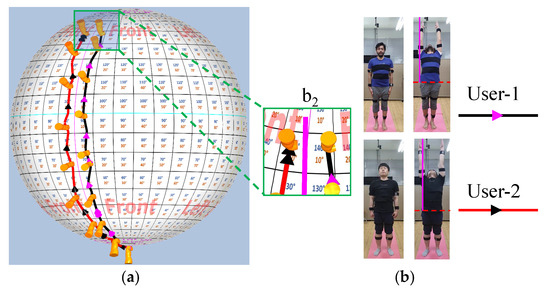 Various poses within the ROM data from the same user with two iterations are mapped on the Motion-sphere. The Motion-sphere aids in understanding subtle variations in human motion by magnifying the differences in the motion visually. Figure 16 is a sample visualization of two motions with subtle variations that are visually unrecognizable in the image. In Figure 16a, user-1’s right arm is slightly tilted to the right of the reference line (pink line), while the user-2’s right arm is tilted to the left of the reference line. This subtle 10° variation in the motion is noticed in the Motion-sphere. In addition, the body anatomy of the individuals and the calibration are some factors that influence the comparison. However, such comparisons are mainly helpful in rehabilitation, where patients’ recovery can be measured based on changes in their bone segment rotation over time [26,27].