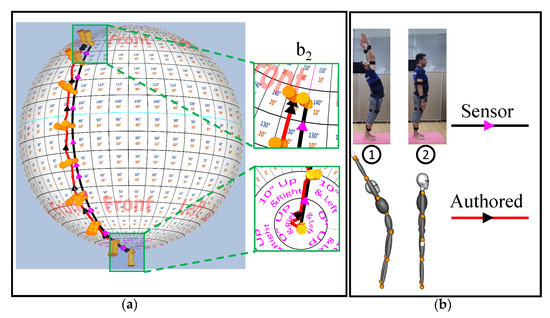 (a) Trajectories of the right upper arm () for both the authored and sensor-acquired. (b) Key frames (1 and 2) as performed by the user and as authored on the 3D avatar.