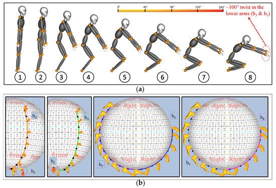 The Motion-sphere aids as a tool in authoring new motion, and editing the existing motion in a desired manner. A prototype implementation of the authoring/editing system with the help of Motion-sphere is demonstrated here. Figure 18 shows another example of newly authoring a squat motion with eight key frames. The authoring of a squat motion was achieved without any preexisting data points; it is quite natural that a greater number of key frames means a more realistic human motion reconstruction. Squat motion demonstrates the authoring of a full body motion such as swing in upper and lower limbs, and twist in lower arms (100°, as noted by the colored miniature model). Figure 18b shows the visualization of the authored motion, where two bones (one limb) are combined in a single sphere ([ & ],[ & ],[ & ],[ & ]). The Authoring/Editing tool is a prototype implementation; we intend to explore Motion-sphere’s actual usage and its impact in the field of human motion authoring and editing in future work.