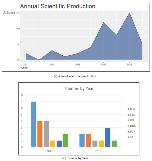 Annual scientific productions are shown in Figure 3a. Publications correspond to the years between 2011 and 2020. From this figure, it is concluded that the number of papers has increased over the years. However, throughout this period of time, the trend did not always increase, and there are some years in which production in the area decreased. Between the years 2011–2012, 2013–2014, and 2017–2019 there was a decrease of two, two, and six proposals, respectively.