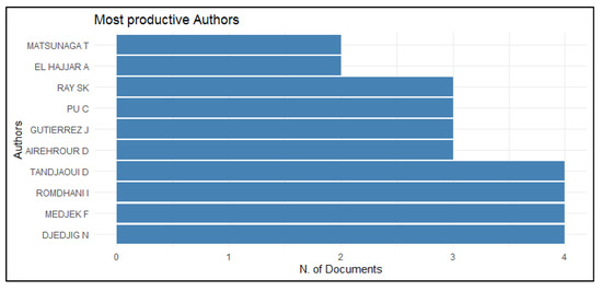 Table 10 lists the contributions of the authors mentioned in Figure 4. From this table, we can obtain information that Figure 4 by itself does not provide. The authors S.K. Ray and J. Gutierrez are listed in Figure 4 with three contributions each, although these contributions are the same for both authors. The same happens with the authors D. Tandjaoui, F. Medjek, and N. Djedjig, for whom Figure 4 shows four contributions. Other information that can be inferred from Table 10 is the period of publication, and it is considered that these authors maintain their current research line, with 2019 or 2020 being the last year of publication, except for the authors T. Matsunaga and A. El Hajjar.