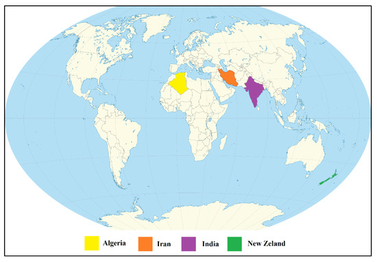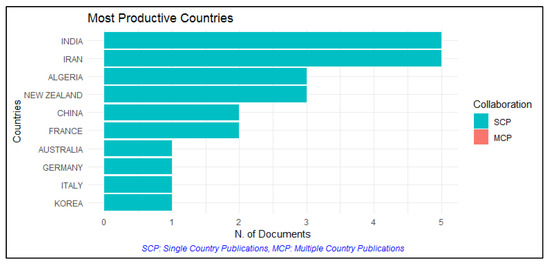 Figure 5 shows the most productive countries; a high concentration of publications are in Algeria, India, Iran, and New Zealand with three productions each.