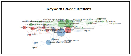 Figure 7 shows the keyword co-occurrences. The network resulting from the analysis of keywords co-occurrences shows three significant groups. The green group shows the relationship of words such as wireless communications, energy consumption, hardware, authentication between others. Red group evidences the association between protocols, monitoring, topology, maintenance, and security. The blue group shows the relationship between words such as the internet of things, 6lowpan, IoT, trust, sinkhole attack, version number attack, sensors, and intrusion detection. The image shows us the closeness of these three groups, indicating their close relationship. The spheres’ size representing each of the keywords indicates their level of importance within the group. The larger the sphere, the more significant its relevance. Links indicate the relationship between keywords in the same group.
