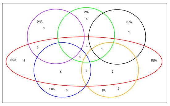Figure 9 shows a Veen diagram detailing the number of proposals that mitigate one or a set of attacks. Seven proposals mitigate only the RSA attack. In this diagram, we can see that the attack with the most significant presence in the line of research reviewed is the attack encoded with the RSA theme code (See Table 5). Likewise, this is the attack that the authors mitigate in conjunction with other attacks in the same proposal. According to Figure 9, three proposals mitigate RSA and DNA, five proposals mitigate RSA and SBA (Selective forwarding/Blackhole attack), four proposals mitigate RSA, WA(Wormhole attack), and SBA, one proposal mitigates RSA, SBA, and SA (Sybil attack), one proposal mitigates RSA, D2A, and SA, and one proposal mitigates RSA, WA, D2A, and SA. It can also be concluded that this issue is mitigated in conjunction with all the attacks summarized in Table 5.