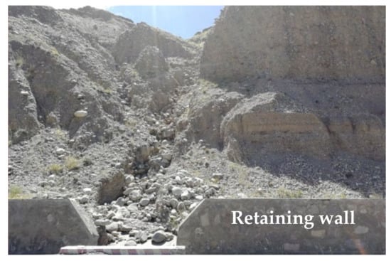 Soil–rock mixture (SRM) refers to a type of uneven loose deposit material mainly composed of stone, fine-grained soil, water, and pores that is between a homogeneous soil and fractured rock mass from the quaternary period []. SRM landslides are widely distributed in China. There have been 1736 landslides in the 100 km2 area within the catchment of the upper Yangtze River, of which approximately 64% were SRM landslides []. Slip zones of large landslides in the Three Gorges area are commonly set on fine-grained soil horizons with a significant amount of coarse-grained particles, particularly gravel-sized particles []. There are a large number of slopes in a critical stable state composed of sand–pebble mixture (SPM) mainly composed of pebble, sand, partial clay soil, water, and pores, which is a special type of SRM in Tibet, as shown in Figure 1. SRM landslides have produced serious damage to social security and project construction in the midwestern region of China. Thus, it is of great importance to study the deformation and strength mechanisms, the shear deformation process, and disaster prevention in SRM landslides.