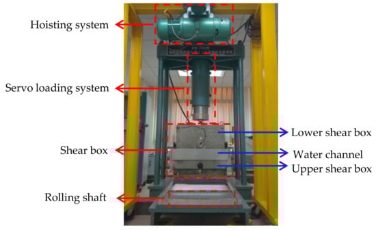Deformation tests were carried out by an SRM-1000 type large-sized geotechnical shear strength test apparatus made by Institute of Geology and Geophysics, Chinese Academy of Sciences, Beijing, China, which is one of few pieces of laboratory equipment controlled by a motor servo []. The advantage of this device is that the motor servo can achieve long-term creep loading. The equipment is composed of a hoisting system, servo loading system, shear box, measurement system, control system and a rolling shaft with low friction, as shown in Figure 4. The upper shear box is fixed to bear vertical loading, while the lower shear box can move to bear horizontal loading. The vertical force is applied to the stiff iron plate in the upper shear box to provide consolidation for the specimen. The upper box and lower box are connected by a dragging track to prevent the rotation of the upper box. The maximum shear plane clearance of the shear box is 30 mm. The maximum vertical and horizontal loadings are 1000 kN. The resolution of the loading is 0.34 kN in the vertical and horizontal directions. The maximum loading rate of the loading system is 4.0 mm/min. The maximum shear displacement is 100, with an accuracy of 0.05 mm. The shear box is 300 in length, 300 in width, and 300 mm in height. The maximum particle size (d) of the artificial SRM is determined based on the minimum dimension of the specimen (D); the relationship D/d = 6 was proposed by Marsal []. Thus, considering the size effect of the particles, the maximum grain size of the block stone in group L3 was approximately 1/6 of the shear box size.