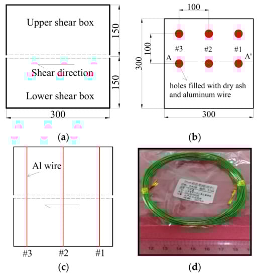 Schematic of the installation of Al wires. (a) Front view of the shear box (mm); (b) the top surface of the shear box (mm); (c) profile map of AA’ in (b); (d) aluminum (Al) wires with a diameter of 1.0 mm.