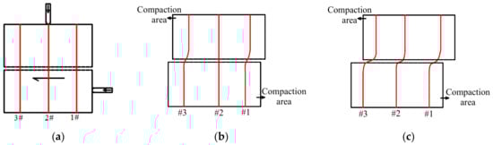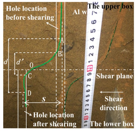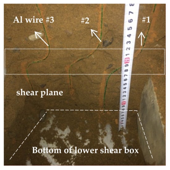 The high heterogeneity of SRM produces deformation characteristics of the shear zone during the shear process that differs from those of soil []. Soft aluminum (Al) wires with diameters of 1.0 mm were inserted in holes with diameters of 5.0 mm, which were drilled from the top of the upper sample to the bottom of the sample (Figure 5). The gaps around the Al wires were filled with dry ash. The Al wires are extremely soft, fine, and cannot withstand resistance. Thus, deformation of the Al wires can correspond to shear plane slipping. Therefore, they can be used to realize the slippage characteristics of stone particles, the deformation of shear zone slip, and its evolution law under the condition of a closed shear box. The three groups of Al wires were denoted as #1, #2, and #3, in turn (Figure 5b).