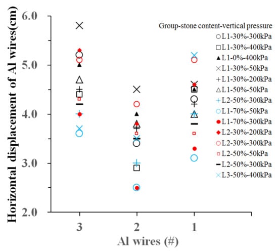 For stone content of 30%–50%, there was a critical threshold for the stone content. When the stone content reached the critical threshold, the skeleton structure was formed in the sample. The deformation and strength of the specimen then began to be determined by the block stones. The larger the block stones were, the more obvious the block stones’ occlusion was. In addition, the block stones underwent a tip cut or staggered redistribution. In this case, the shear failure mode of SRM was dominated by dilatancy deformation. Strictly speaking, when the stone content was just greater than the critical threshold, this sample material could be called SRM. When the stone content was less than the threshold (30%), the stones had little effect on the deformation of the SRM, and the mechanical properties of the material could be treated as the soil. When the stone content reached 50%, the formative stone skeleton structure had an obvious effect on the deformation, and the mechanical strength of the SRM was affected by both the stones and soil simultaneously. When the stone content reached 70%, the aerial structure of the SRM had been formed. The deformation rules of the Al wires directly reflected the motion state and motion law of the block stones and fine-grained soil of the SRM. The stone content, stone size, and stone distribution directly affected the bending deformation of the Al wires, i.e., the degree of dispersion of the block stones around the Al wires affected the deformation of the Al wires. The more the block stones gathered, the greater the possibility of angular bending of the Al wires was [].