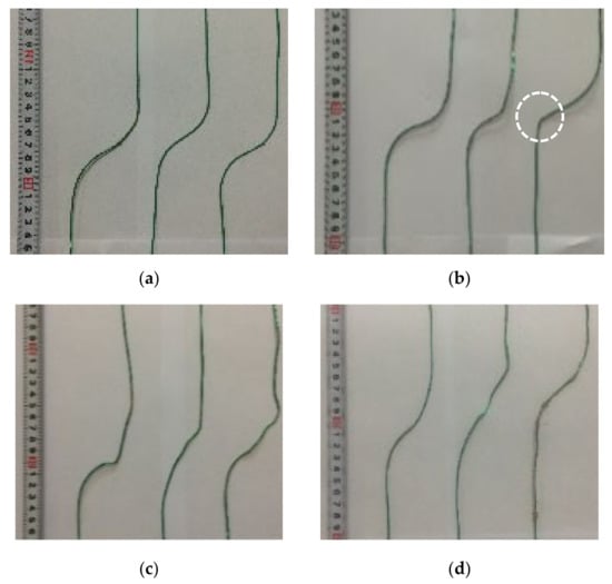 Deformation characteristics of Al wires in samples of group L1 with a vertical pressure of 400 kPa and different stone contents. (a) Stone content 0%; (b) stone content 30%; (c) stone content 50%; (d) stone content 70%.
