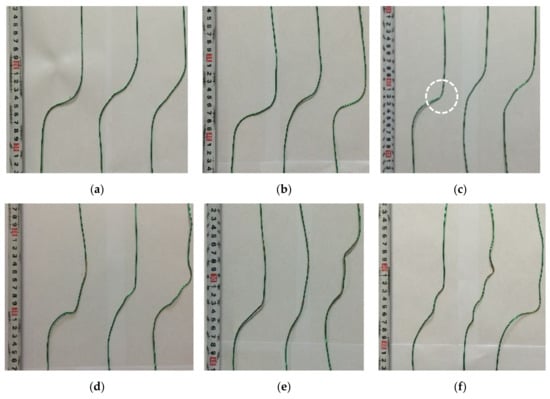 Comparison of the deformation characteristics of Al wires in samples after shear tests. (a) L1 stone size with a stone content of 30% and vertical pressure of 200 kPa; (b) L2 stone size with a stone content of 30% and vertical pressure of 200 kPa; (c) L3 stone size with a stone content of 30% and vertical pressure of 200 kPa; (d) L1 stone size with a stone content of 50% and vertical pressure of 400 kPa; (e) L2 stone size with a stone content of 50% and vertical pressure of 400 kPa; (f) L3 stone size with a stone content of 50% and vertical pressure of 400 kPa.