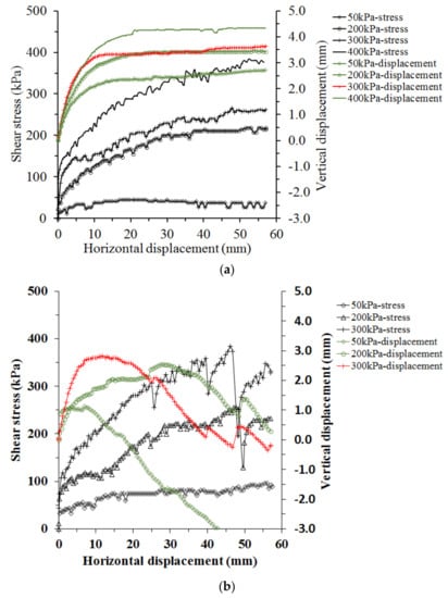 Shear stress and vertical displacement versus horizontal displacement. (a) L3 stone content of 50%; (b) L3 stone content of 70%.