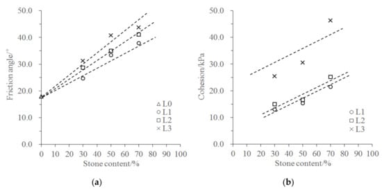 Parameters of shear strength versus the stone content of SRM. (a) Friction angle versus stone content; (b) cohesion versus stone content.