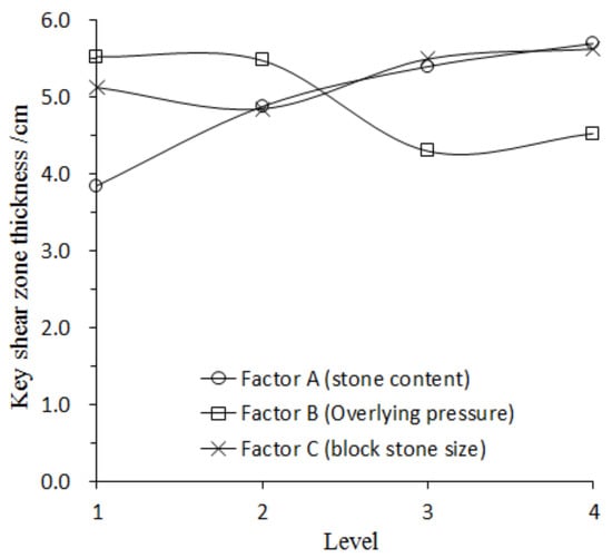 The orthogonal test results in Table 2 were used to perform a range analysis. The levels of the three factors were listed in Table 3. Equation (1) [] was used to calculate and analyze the primary and secondary relationships of the factors. The matrix L16(43) was used to analyze the key shear zone thickness, considering the three factors, j (stone content, vertical pressure, and block stone size), and the four levels, m (1, 2, 3, 4), in Table 4. The thickness of the key shear zone increased with the stone content increasing. The thickness of the key shear zone decreased with the vertical stress increasing. However, the thickness changed less with the block stone size increasing (Figure 14). The range values of the three factors, j, from largest to smallest were A > B > C (Table 4). The results indicated that the stone content had the greatest effect on the thickness of the key shear zone, with the vertical pressure second, and then the block stone size.