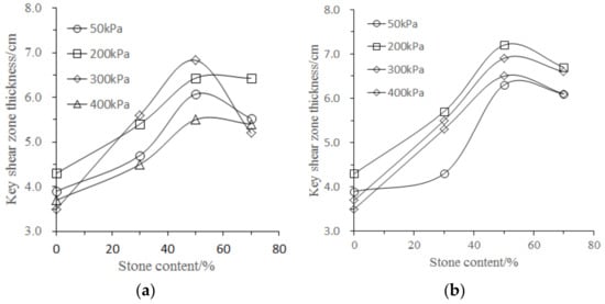 The key shear zone thickness initially increased and then decreased with vertical stress increasing for different block sizes (Figure 20). Under the vertical pressures of 50 to 300 kPa, the movements of the block stones and fine particles were mainly rotation or expansion. The interaction of the block stones increased with vertical stress increasing. The “gear effect” of the SRM gradually became more prominent. As a result, the key shear zone thickness gradually increased. At vertical pressures of greater than 300 kPa, the improvement in the sample compactness directly increased the degree of embedding of the block stones in the vertical and horizontal directions in the SRM. There was insufficient energy for the block stones to swell along the stone interface under the greater vertical pressure. Thus, the movements of the block stones were mainly characterized by dislocation redistribution and corner cutting. The key shear zone thickness began to decrease (Figure 20a,b). With a higher stone content (70%) and larger size (group L3), stone movement patterns of dislocation redistribution, corner cutting, and dilatancy coexisted (Figure 20c). Therefore, the change in the key shear zone thickness was closely related to the stone content, stone size, overburden pressure, and stone strength.