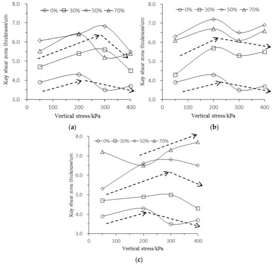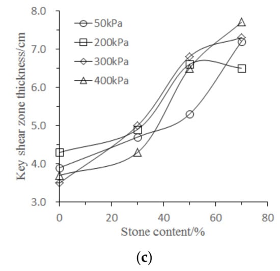 Effect of stone content on the key shear zone thickness. (a) Stone size L1; (b) stone size L2; (c) stone size L3.