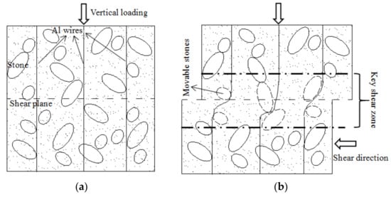 Schematic diagram of the movement state of block stones during shearing. (a) Before shearing; (b) after shearing.