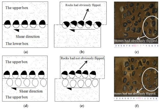 In the vicinity of the shear plane, two types of block stones arrangements occurred: One was a single row throughout the shear surface, and the other was a double row (Figure 17a,d). The upper parts of the block stones were dyed black. In the shear process, the block stones were compacted and rolled with the slippage of the shear surface. The stones marked with black pigment have clearly been reversed, as shown in Figure 14b,c. In contrast, it was difficult to flip the block stones arranged in two rows. Instead, the shearing was mainly manifested as horizontal compaction and climbing movement among the stones along the interface between the upper sample and lower sample (Figure 17e,f). The fracture surface of the SRM formed along the stones surrounding the shear plane, i.e., the block stones produced a dilatancy effect. Thus, under the conditions of high stone content and large particle size (Figure 15c), the large stones near the shear plane had a dilatancy effect with shear sliding, resulting in an increase of the effect range of the shear zone.