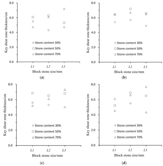 Variation in the key shear zone thickness with increasing stone sizes under different vertical pressures. (a) 50; (b) 200; (c) 300; (d) 400 kPa.