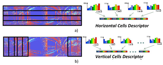 Following that, once the image is filtered with the different masks and scales, the algorithm divides each resulting image into horizontal cells (position descriptor) or into overlapped vertical cells (orientation descriptor), as seen in Figure 1, and the average intensity inside each cell is calculated.