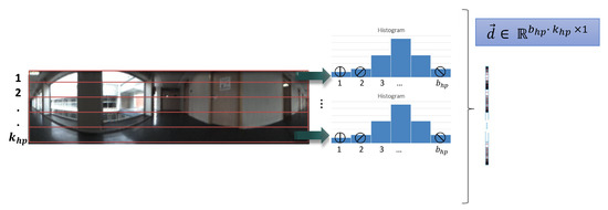 Once the HOG description is performed, the whole image is reduced to a vector whose size will depend on the number of cells and bins as Figure 1. First, the position descriptor, is the number of bins per histogram and is the number of cells in which the image was divided. The descriptor size is . Second, in the case of the vertical cells descriptor, the cells are overlapped. This descriptor introduces a new parameter which refers to distance between consecutive cells. is the number of cells, and it is calculated by , where is the number of columns of the panoramic image. is still referring to the number of bins per histogram. At the end, HOG with vertical cells reduces a panoramic image into a vector whose size is . The parameters of the descriptors are summarized in Tables S1 and S2, and the values used in the experiments are specified in Section 6.1.