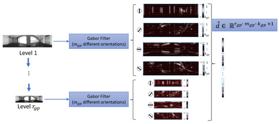 The version of the descriptor used in the present work is built from intensity information, obtained after applying some Gabor filters with different orientations to the image in several resolution levels. To reduce the volume of data each filtered image is divided in a set of cells, and the average intensity of each cell is calculated. As in HOG, classical methods divided the image using horizontal cells [11], whereas new alternatives also tried to use this descriptor using vertical ones [49]. Definitions used in this paper are presented in Table S2 and comprehensively described in [48,49]. Figure 3 shows the process to build the gist descriptor using horizontal cells.