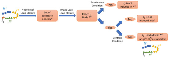 When a new image arrives, the first step is to know if it belongs to an existing cluster. As detailed in Section 4, to perform the Node Level Loop Closure, the Mahalanobis distance is used, (Equation (3)). After that, it is possible to detect if the image descriptor may belong to a specific node , storing all the candidate solutions in the set .