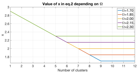 Values of x in the node level loop closure condition versus number of clusters in Equation (4).