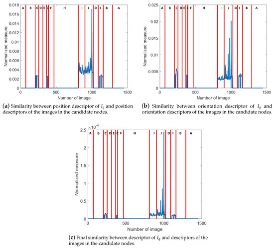 This process is repeated for all the images contained in the set of candidate nodes . After that, the method calculates the inverse of these distance measures, so the images with small distances (images that are more similar) will have higher similarity measure. Then, the result is normalized in such a way that the sum of the similarities is equal to 1. Next, the position and orientation similarity measures are multiplied to obtain the final similarity measure that combines both kinds of information. The image with the associated higher result is then retrieved by the Image Level Loop Closure (and its node as the most similar node to . It is possible to see an example of these measures in Figure 6, where Figure 6a shows the similarity measures between the image and the images in the candidate nodes when using position descriptors; Figure 6b shows the same similarity comparison but using orientation descriptors and Figure 6c shows the final similarity measures obtained by multiplying position and orientation measures. These results (final similarity measure) are the data used to retrieve both the image and the node that close the loop with . Only the images that belong to the candidate nodes have a value in these figures, the other images are considered to have null measure.