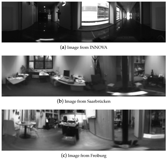 The different image sequences are recorded by a mobile robot, which is equipped with an omnidirectional camera. The catadioptric vision system is made using a hyperbolic mirror mounted in front of the camera on a portable bracket. The program receives the omnidirectional images and it transforms them into panoramic ones and starts the mapping process, updating the map every time that a new image arrives according to Section 4. Additionally, the robot is equipped with wheel encoders and a laser range scan, which are used to obtain the ground truth, for comparative purposes. However, the proposed method does not use these data and it carries out the incremental mapping with pure visual information. Figure 7 shows the robot and the camera used to capture the INNOVA dataset. Complete information about the equipment used to capture the COLD dataset can be found in reference [53]. Figure 8 shows some sample images from all the datasets.