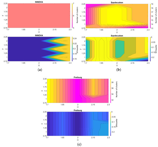 Results obtained with the gist descriptor for different values of y and for the datasets (a) INNOVA, (b) Saarbrücken and (c) Freiburg. The first row of each subfigure shows the final number of clusters (colour mapped) and the second one the average silhouette (colour mapped) after the proposed incremental hierarchical mapping process.